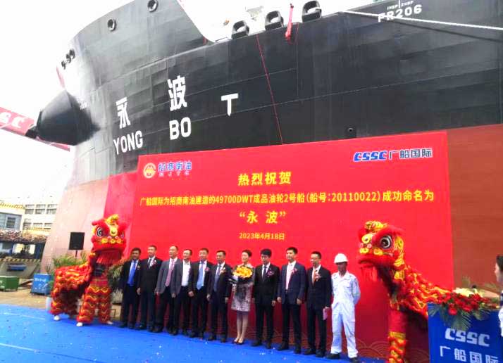 2023年4月18日,中国船舶集团有限公司旗下中国船舶工业贸易有限公司联合广船国际有限公司为招商局集团有限公司旗下招商局南京油运股份有限公司建造49,700载重吨成品油船“永波”号在龙穴码头举行命名交付仪式。
